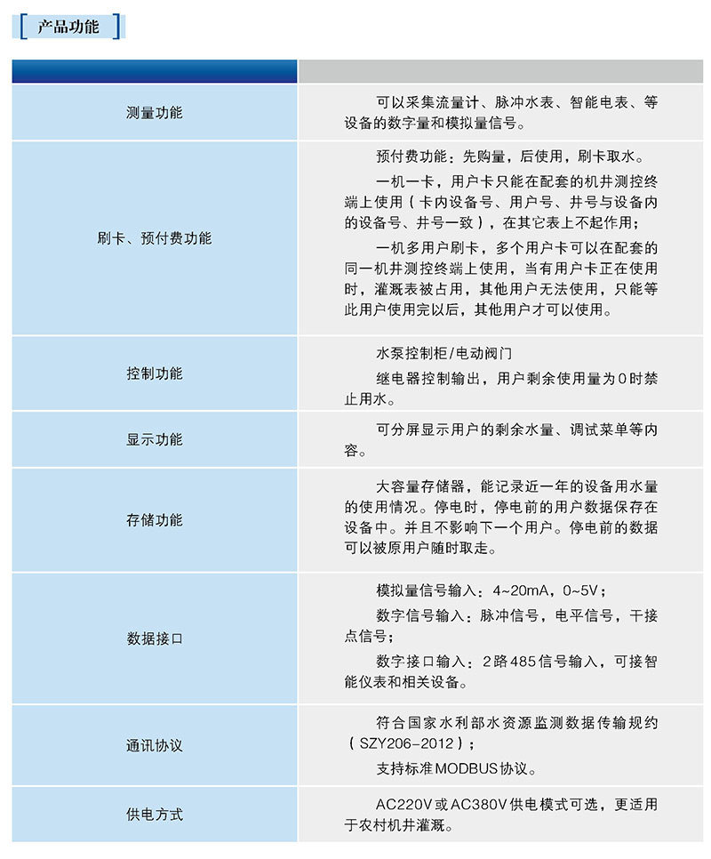 该产品是针对农日水利灌溉行业开发的一款智能遥测控制终端,已经通过国家水利部水资源监测数据传输规约(SZY206-2012),遥测控制终端内置高性能微处理器,可以完成对外部的模拟信号,数字信号以及脉冲信号的采集、转换、处理、存储、显示、传输等功能,并且同时具备对外部用电设备的控制功能。