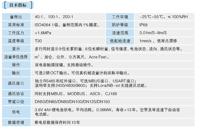本产品通过采集信号波形进行波形相关等运算得到传播时差的技术,因而具有了高精度、低飘移、抗干扰、稳定可靠等显著特点。该款产品采用防水密封胶灌封,可以浸水工作。